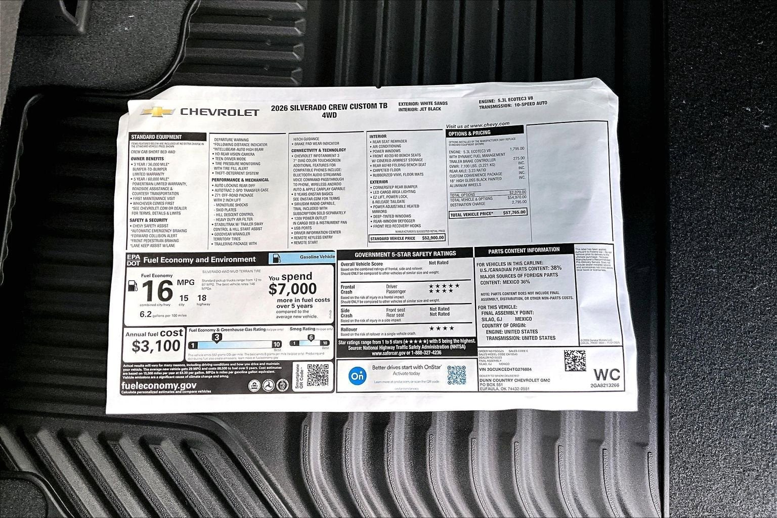 White Sands 2026 Chevrolet Silverado 1500 Custom Trail Boss 4WD 10-Speed Automatic EcoTec3 5.3L V8 10-Speed Automatic, 4WD, Jet Black Cloth, 10-Way Power Driver Seat with Lumbar, 120-Volt Bed Mounted Power Outlet, 120-Volt Interior Power Outlet, 170 Amp Alternator, 220 Amp Alternator, 3.5 Monochromatic Display Driver Info Center, 4-Wheel Disc Brakes, 40/20/40 Front Split-Bench Seat, 6 Speakers, 6-Speaker Audio System, ABS brakes, Air Conditioning, Alloy wheels, AM/FM radio: SiriusXM, Apple CarPlay/Android Auto, Auto High-beam Headlights, Auto-Locking Rear Differential, Automatic Emergency Braking, Auxiliary External Transmission Oil Cooler, Bluetooth® For Phone, Brake assist, Cloth Seat Trim, Color-Keyed Carpeting Floor Covering, Compass, Custom Convenience Package, Deep-Tinted Glass, Delay-off headlights, Driver door bin, Driver vanity mirror, Dual Exhaust with Polished Outlets, Dual front impact airbags, Dual front side impact airbags, Dual Rear USB Ports (charge Only), Electric Rear-Window Defogger, Electronic Cruise Control, Electronic Stability Control, Emergency communication system: OnStar, External Engine Oil Cooler, EZ Lift Power Lock and Release Tailgate, Following Distance Indicator, Forward Collision Alert, Front anti-roll bar, Front Center Armrest w/Storage, Front Pedestrian Braking, Front reading lights, Front Rubberized Vinyl Floor Mats, Front wheel independent suspension, Fully automatic headlights, HD Rear Vision Camera, Heated door mirrors, Heavy-Duty Air Filter, Hill Descent Control, Hitch Guidance, Illuminated entry, Integrated Trailer Brake Controller, IntelliBeam Automatic High Beam on/Off, Lane Keep Assist with Lane Departure Warning, LED Cargo Area Lighting, Low tire pressure warning, Manual Tilt Wheel Steering Column, Occupant sensing airbag, OnStar Services Capable, Outside temperature display, Overhead airbag, Overhead console, Panic alarm, Passenger door bin, Passenger vanity mirror, Performance Red Recovery Hooks, Power door mirrors, Power driver seat, Power Front Windows with Driver Express Up/Down, Power Front Windows with Passenger Express Down, Power Rear Windows with Express Down, Power steering, Power windows, Preferred Equipment Group 2CX, Premium audio system: Chevrolet Infotainment 3, Radio data system, Radio: Chevrolet Infotainment 3 System, Rear 60/40 Folding Bench Seat (folds Up), Rear reading lights, Rear Rubberized-Vinyl Floor Mats, Rear step bumper, Rear window defroster, Remote Keyless Entry, Remote keyless entry, Remote Vehicle Starter System, Security system, Single Outlet Exhaust, SiriusXM Trial Subscription, Speed control, Speed-sensing steering, Split folding rear seat, Standard Tailgate, Suspension Package, Tachometer, Teen Driver, Theft Deterrent System (unauthorized Entry), Tilt steering wheel, Tire Pressure Monitoring System, Traction control, Trailering Package, Trip computer, Variably intermittent wipers, Voltmeter, Wheels: 18 x 8.5 Black Painted Aluminum, Wi-Fi Hot Spot Capable, 10-Speed Automatic, 4WD, Jet Black Cloth.