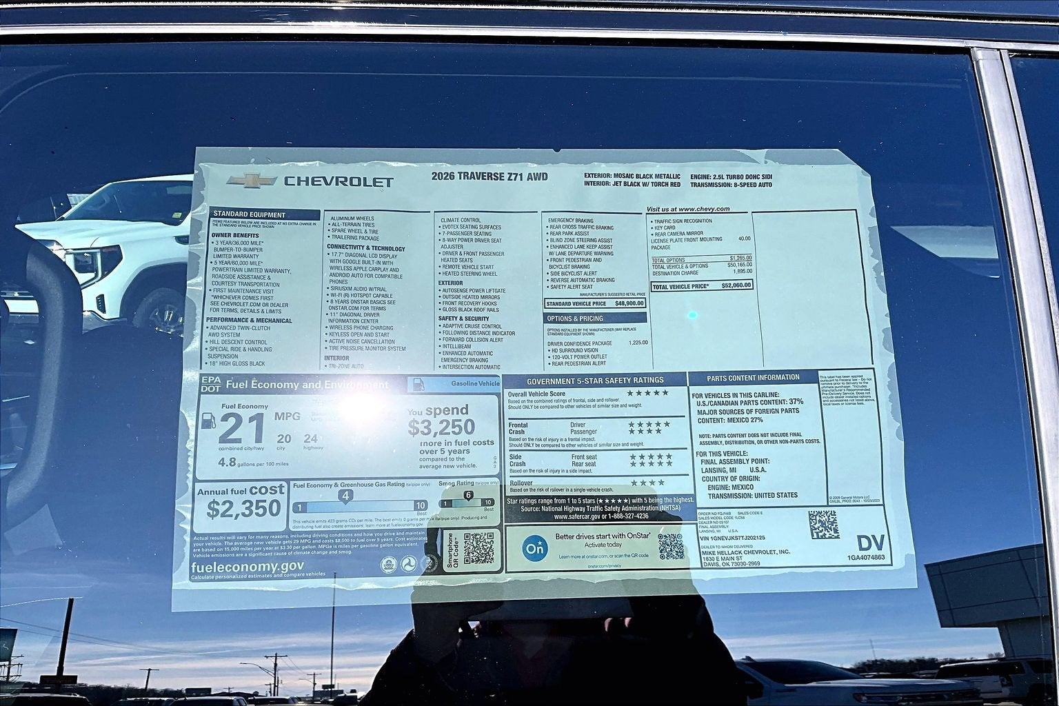 Mosaic Black Metallic 2026 Chevrolet Traverse Z71 AWD 8-Speed Automatic 2.5L DOHC AWD, 3rd row seats: split-bench, 4-Way Manual Front Passenger Seat Adjuster, 4-Wheel Disc Brakes, 6 Speakers, 6-Speaker Audio System Feature, 8-Way Power Driver Seat Adjuster, ABS brakes, Air Conditioning, Alloy wheels, AM/FM radio: SiriusXM with 360L, Apple CarPlay/Android Auto, Auto High-beam Headlights, Automatic temperature control, Brake assist, Child-Seat-Sensing Airbag, Compass, Delay-off headlights, Driver Confidence Package, Driver door bin, Driver vanity mirror, Dual front impact airbags, Dual front side impact airbags, Electronic Stability Control, Emergency communication system: OnStar, Evotex Seat Trim, Four wheel independent suspension, Front anti-roll bar, Front Bucket Seats, Front Center Armrest, Front dual zone A/C, Front reading lights, Fully automatic headlights, HD Surround Vision, Heated door mirrors, Heated Driver and Front Passenger Seats, Heated front seats, Heated steering wheel, Illuminated entry, Key Card, Low tire pressure warning, Navigation System, Occupant sensing airbag, Outside temperature display, Overhead airbag, Overhead console, Panic alarm, Passenger door bin, Passenger vanity mirror, Power door mirrors, Power driver seat, Power Liftgate, Power Outlet, Power steering, Power windows, Preferred Equipment Group 2Z7, Radio data system, Radio: : Audio System w/17.7 Diagonal Display, Rear air conditioning, Rear anti-roll bar, Rear Camera Mirror, Rear Pedestrian Alert, Rear reading lights, Rear window defroster, Rear window wiper, Remote keyless entry, Security system, SiriusXM with 360L Trial Subscription, Speed control, Speed-sensing steering, Spoiler, Steering wheel mounted audio controls, Tachometer, Telescoping steering wheel, Tilt steering wheel, Traction control, Traffic Sign Recognition, Trip computer, Turn signal indicator mirrors, Variably intermittent wipers, Voltmeter, Wheels: : 18 High Gloss Black Painted Aluminum, AWD.