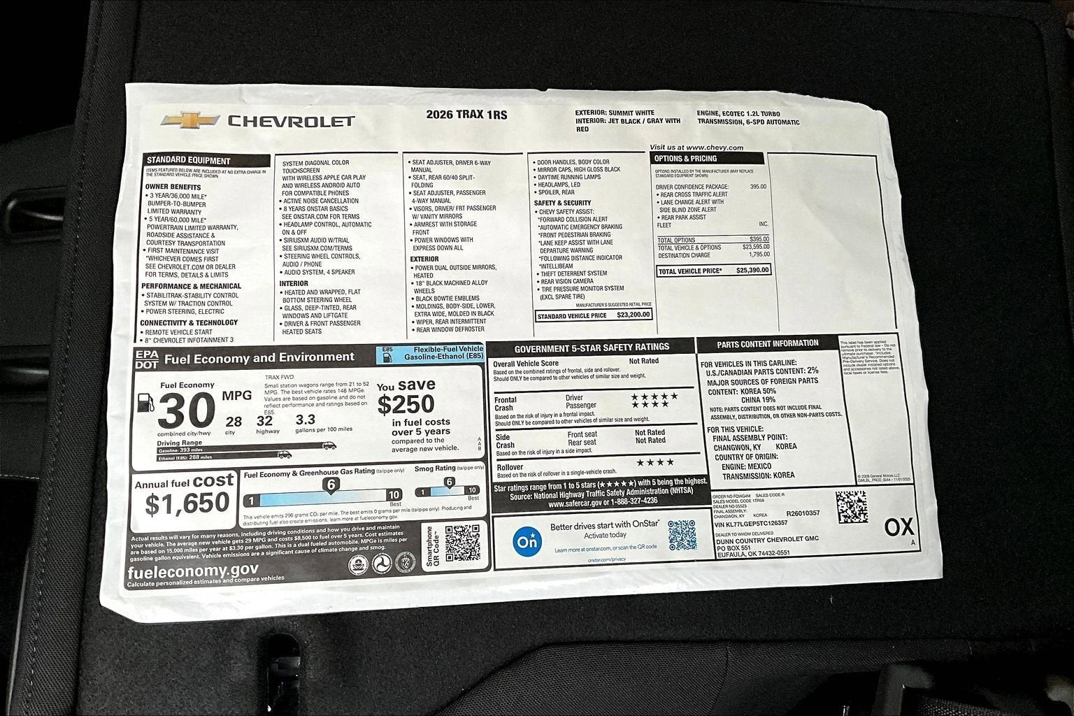 Summit White 2026 Chevrolet Trax 1RS FWD 6-Speed Automatic ECOTEC 1.2L Turbo 2-Way Adjustable Front Head Restraints, 3.50 Final Drive Axle Ratio, 4 Speakers, 4-Speaker Audio System Feature, 4-Way Manual Front Passenger Seat Adjuster, 4-Wheel Disc Brakes, 6-Way Manual Driver Seat Adjuster, ABS brakes, Air Conditioning, Alloy wheels, AM/FM radio: SiriusXM, Auto High-beam Headlights, Brake assist, Bumpers: body-color, Cloth Seat Trim, Compass, Delay-off headlights, Driver Confidence Package, Driver door bin, Driver vanity mirror, Dual front impact airbags, Dual front side impact airbags, Electronic Stability Control, Emergency communication system: OnStar One Essentials, Exterior Parking Camera Rear, Front anti-roll bar, Front Bucket Seats, Front Center Armrest, Front reading lights, Front wheel independent suspension, Fully automatic headlights, Heated door mirrors, Heated Driver and Front Passenger Seats, Heated front seats, Heated steering wheel, Illuminated entry, Lane Change Alert with Side Blind Zone Alert, Leather steering wheel, Low tire pressure warning, Occupant sensing airbag, Outside temperature display, Overhead airbag, Overhead console, Panic alarm, Passenger door bin, Passenger vanity mirror, Power door mirrors, Power steering, Power windows, Premium audio system: Chevrolet Infotainment 3, Radio data system, Radio: Chevrolet Infotainment 3 System with AM/FM, Rear Cross Traffic Alert, Rear Park Assist, Rear window defroster, Rear window wiper, Remote keyless entry, Security system, SiriusXM Trial Subscription, Speed control, Split folding rear seat, Spoiler, Sport steering wheel, Steering wheel mounted audio controls, Tachometer, Telescoping steering wheel, Tilt steering wheel, Traction control, Trip computer, Variably intermittent wipers, Wheels: 18 Black-Painted Machined Aluminum, Wireless Apple CarPlay/Wireless Android Auto.